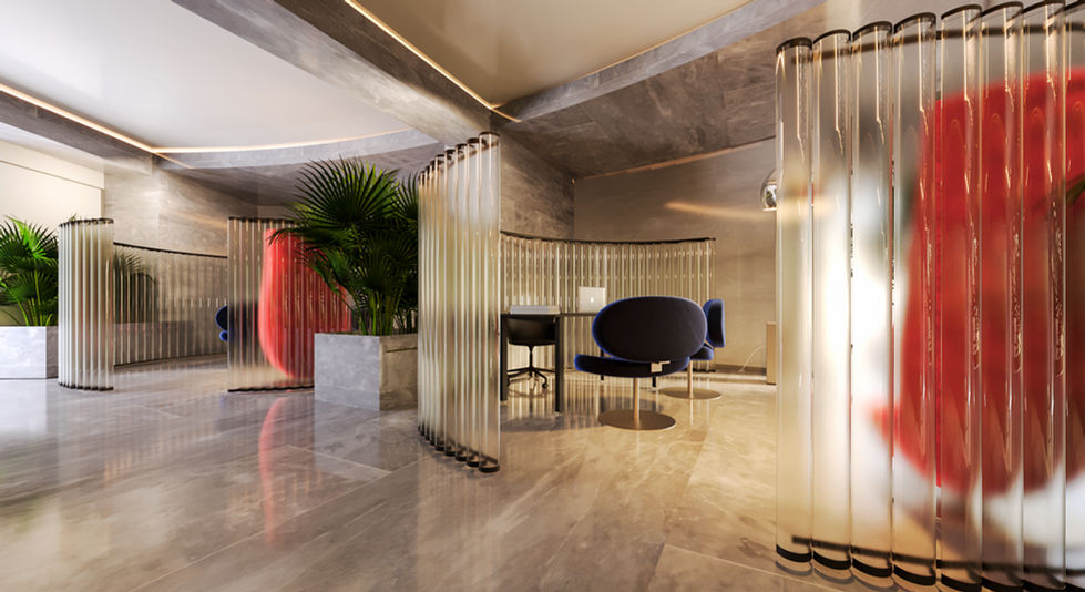 To maintain the feeling of a shared space while creating singular private areas, glass partitions were incorporated in this reception. Shown here are the 3D renders of the space.